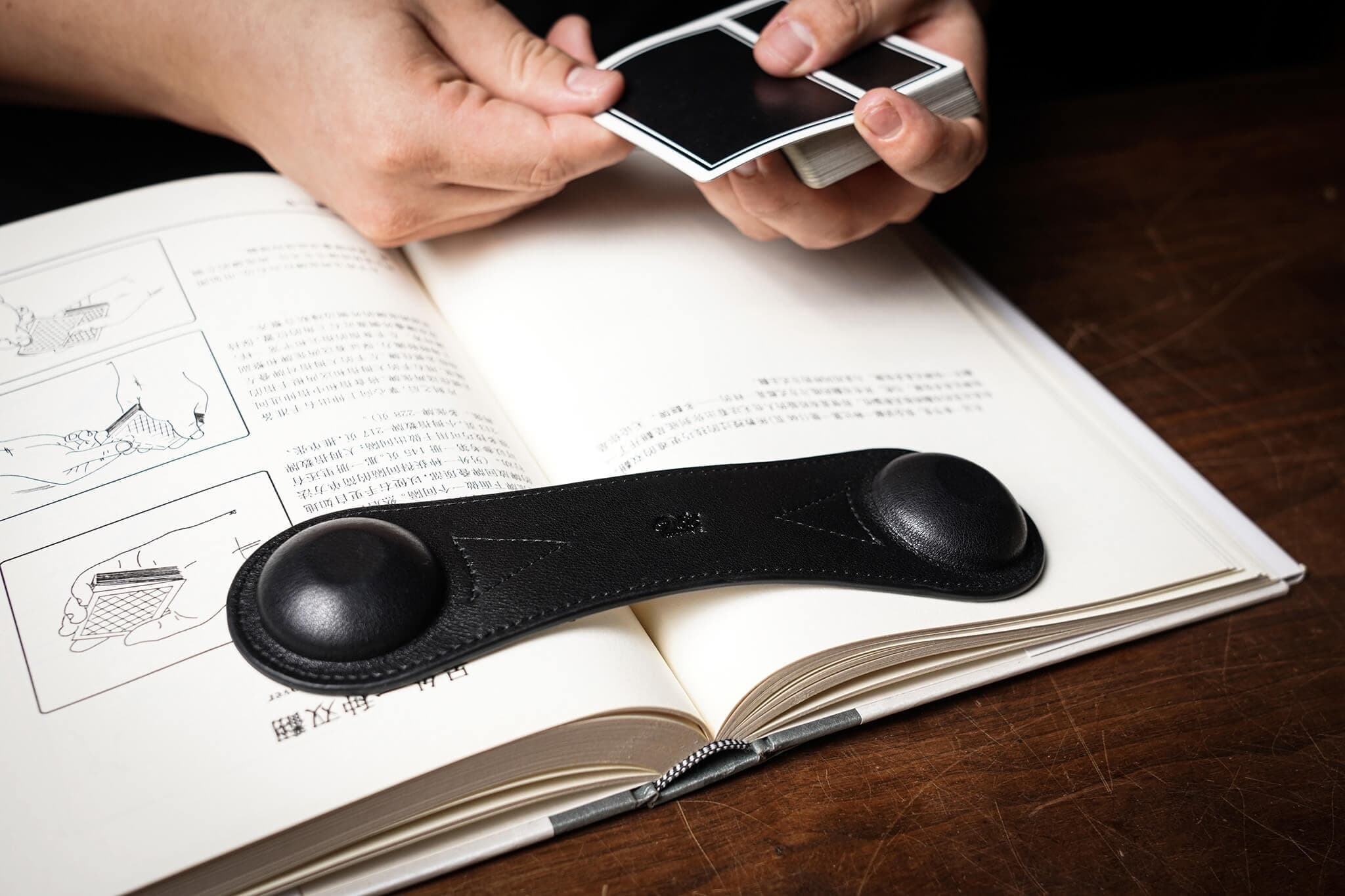 レザーブックウェイトの適度な重みが、大切なマジックの本をきれいに保ちます。