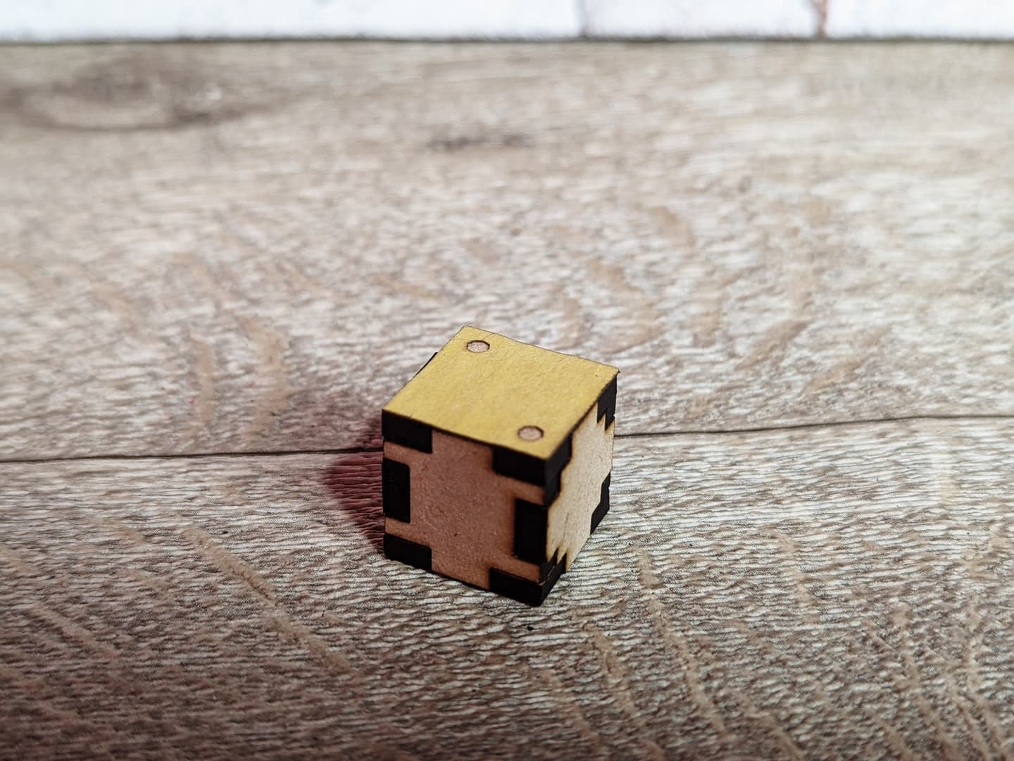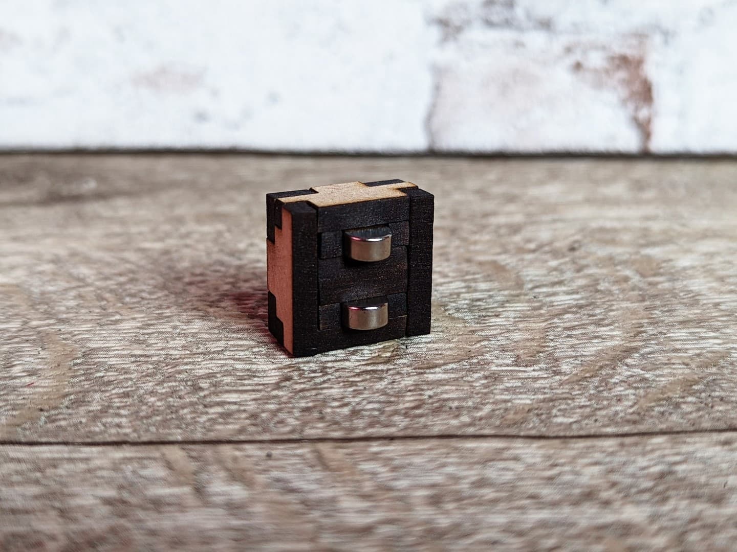 また、不自然な軽さや個体によるロット差、キューブ内でのギミックの不要なずれを防ぐため、写真のように木材を精確にカットしキューブ内に埋め込み作成しております。
