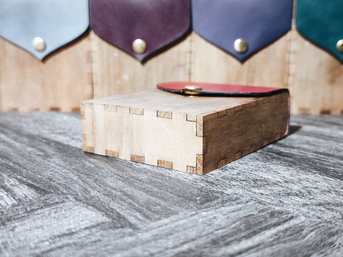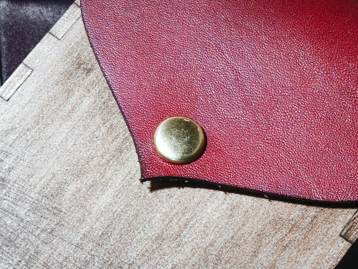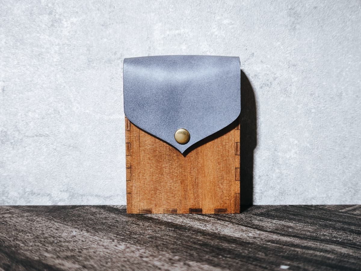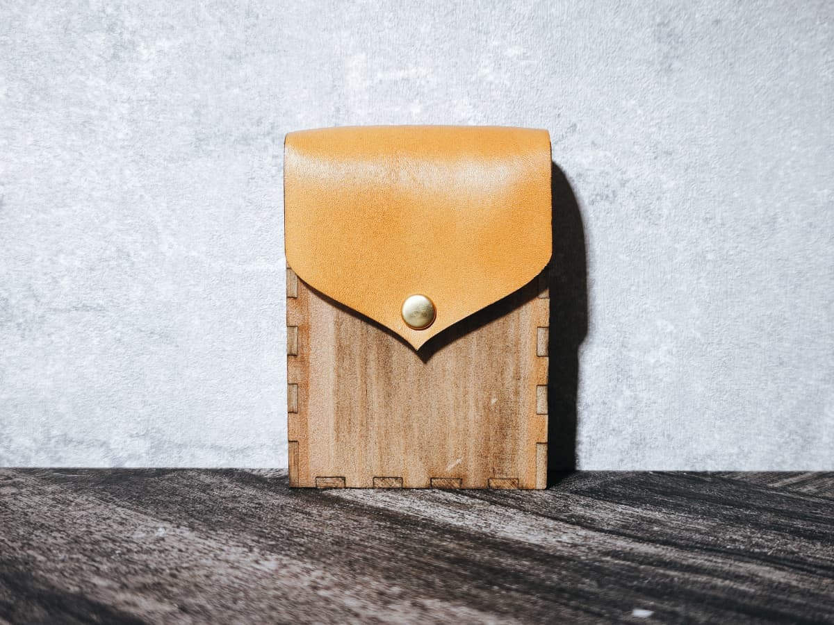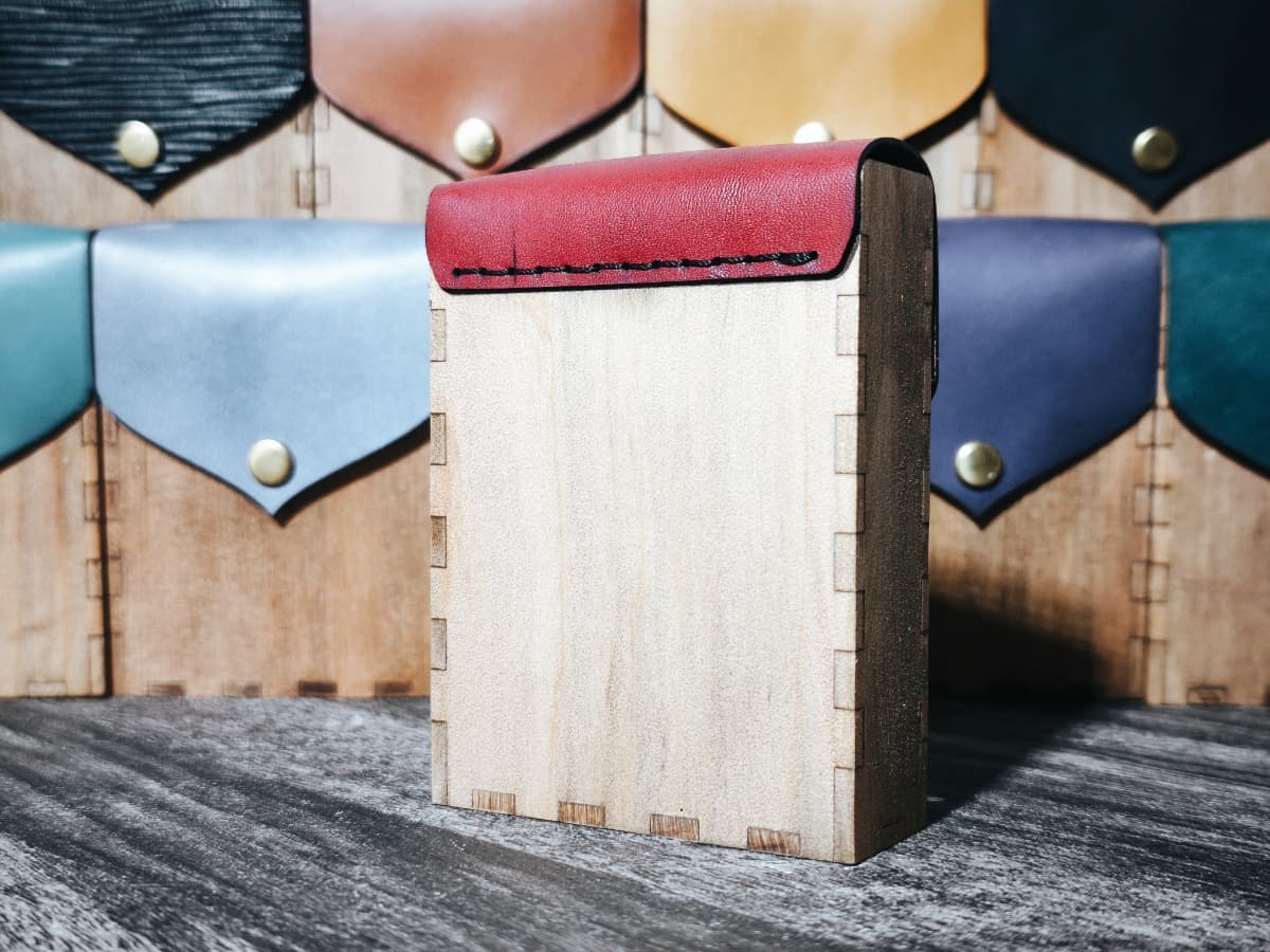 フラップは本革を木材に手縫いにて縫い付け。木材と革が重なる部分は木材を削ることで段差をなくしました。