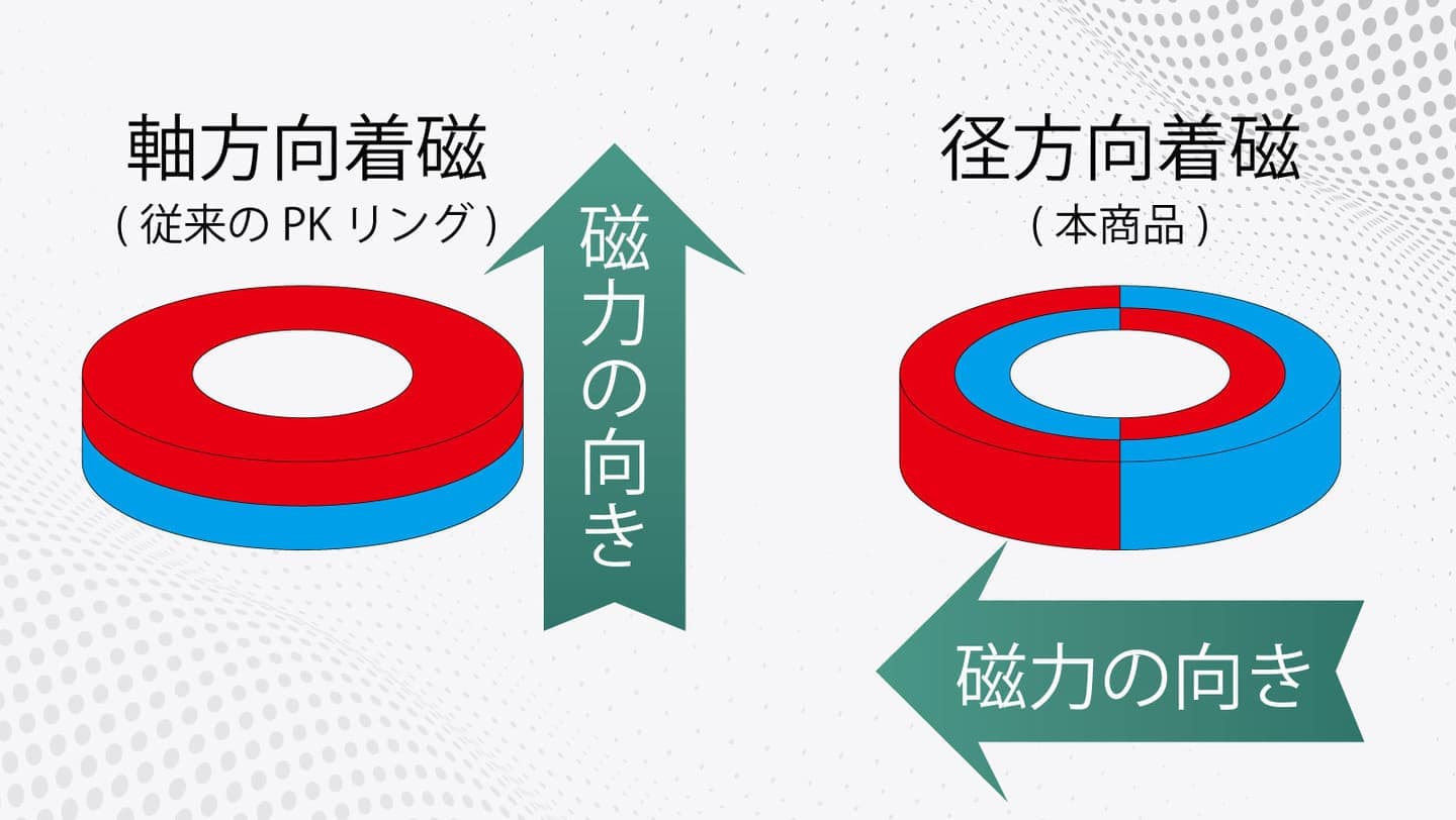 ここで、1からPKリングの可能性を見つめ直し、オリジナルの形状で磁石をオーダーをすることで本商品を製作いたしました。