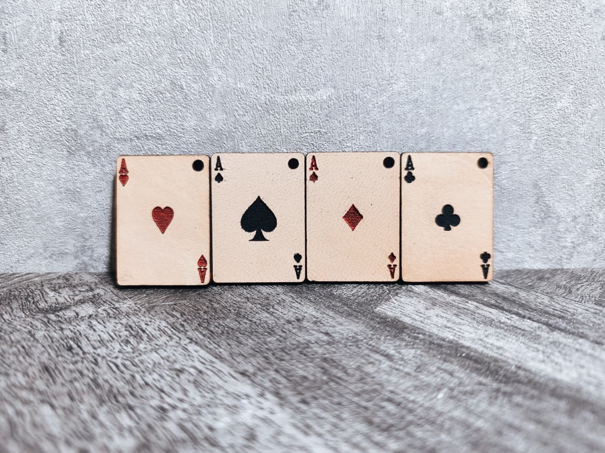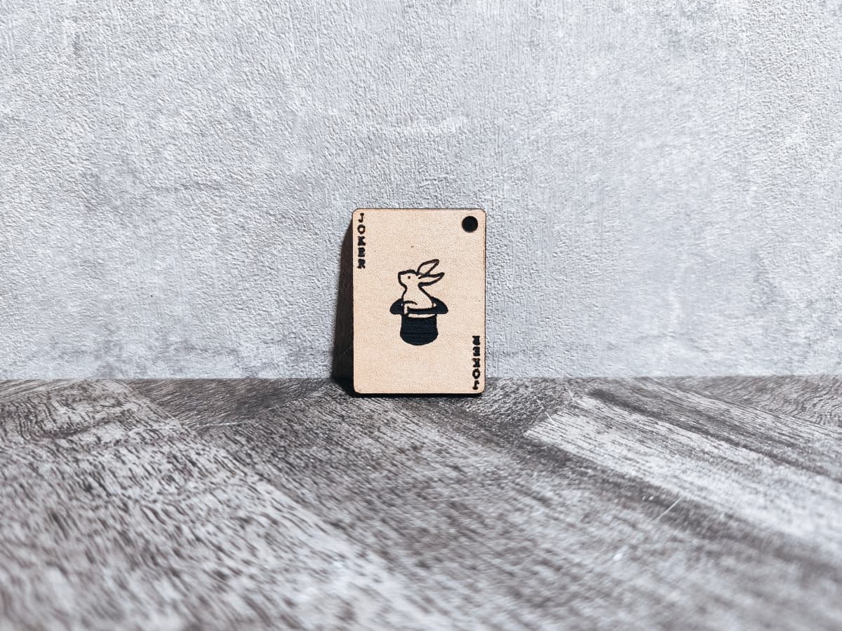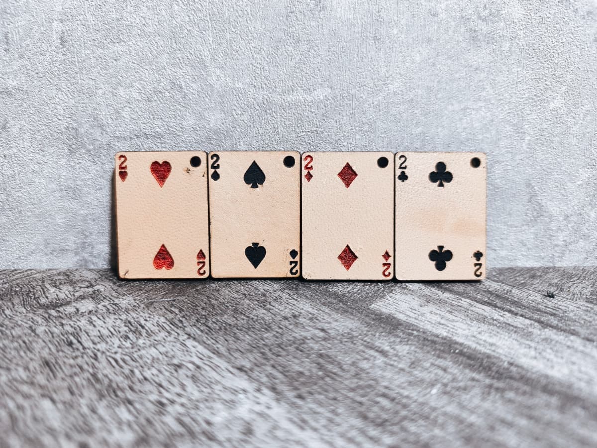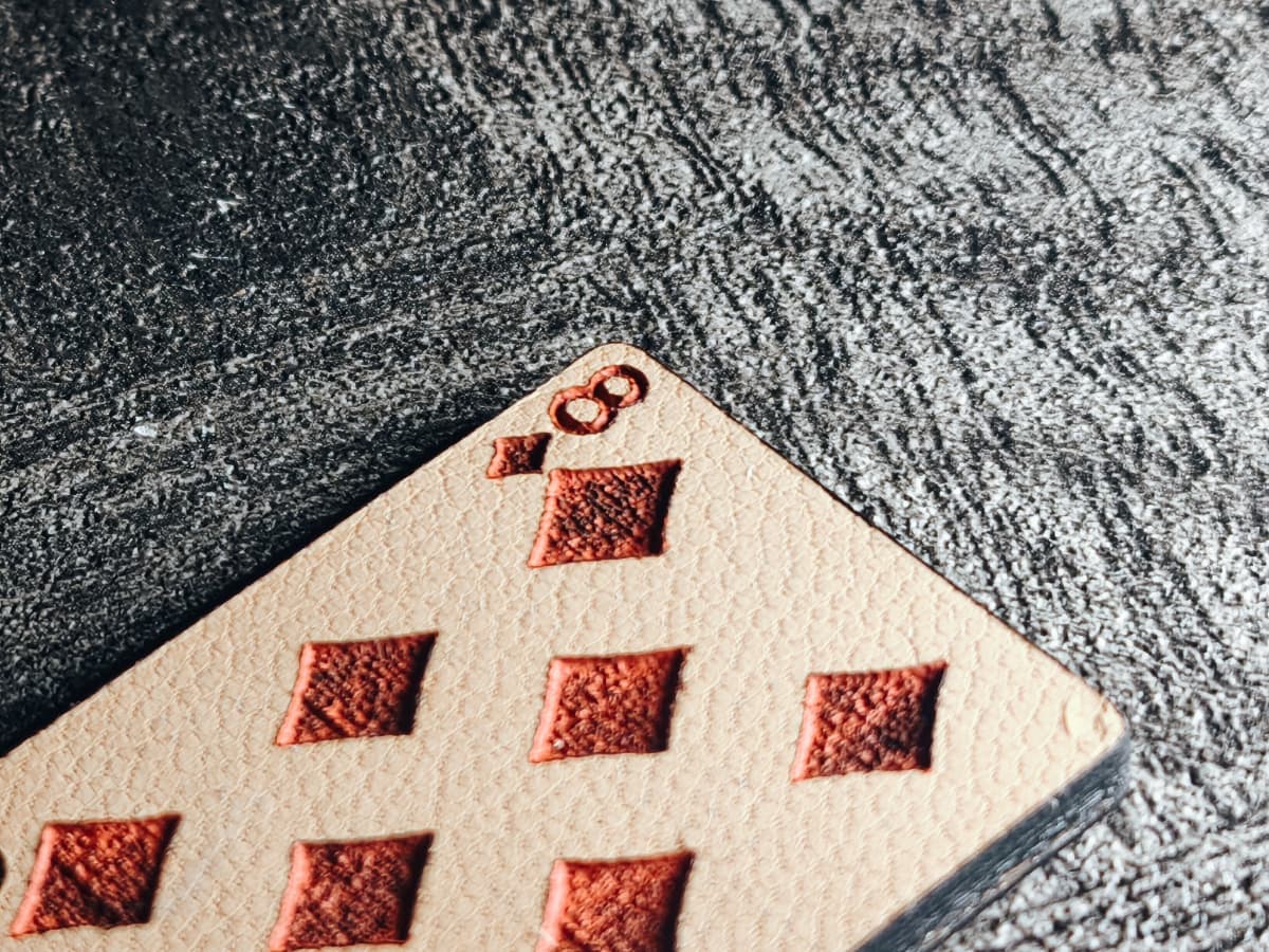 理論的に最も白いタンローと呼ばれる染色前のタンニン鞣し革に木材をヒートプレスにて強力に接着し、トランプの柄にレーザーで彫刻&カット&着色して仕上げました。