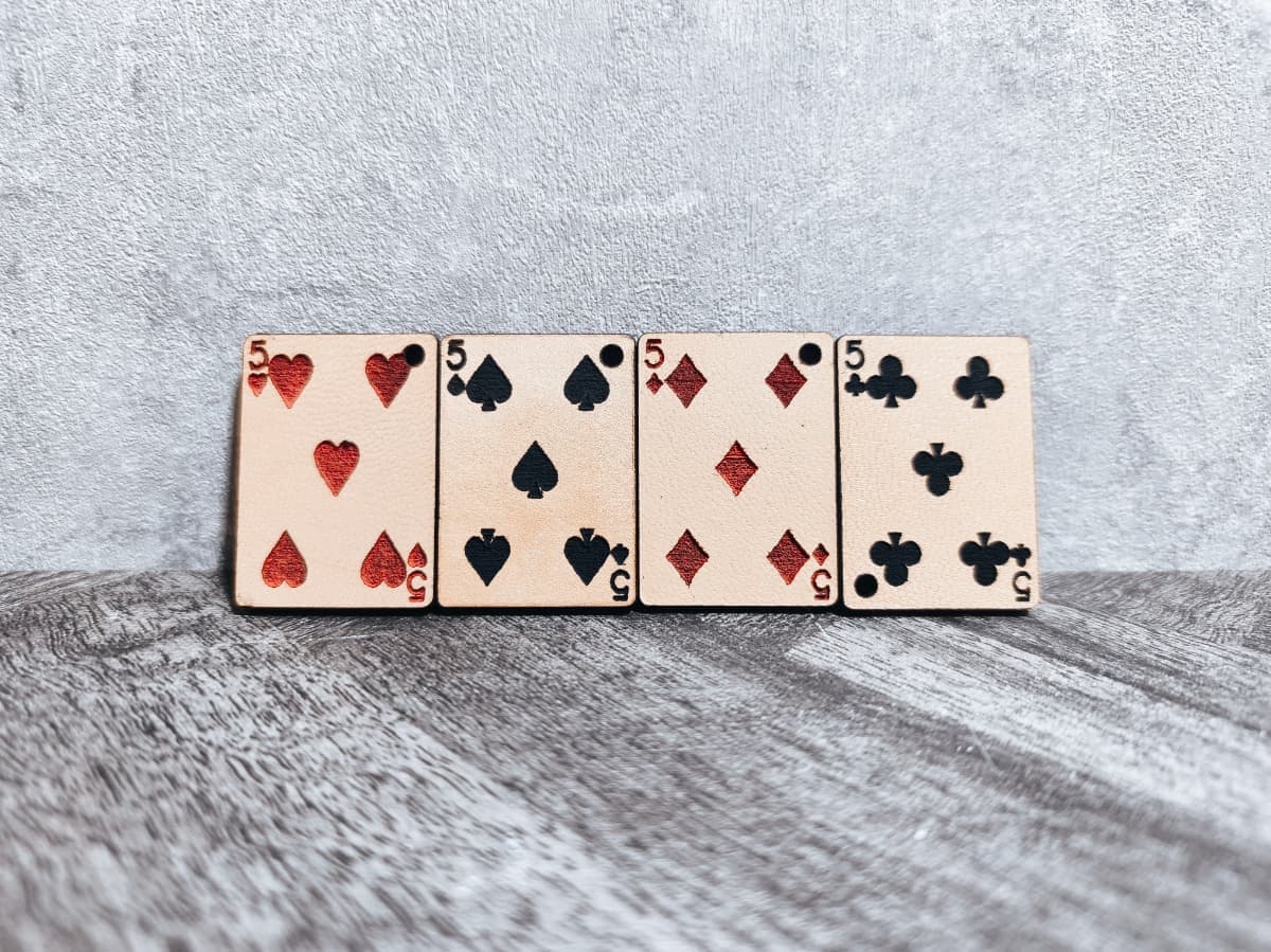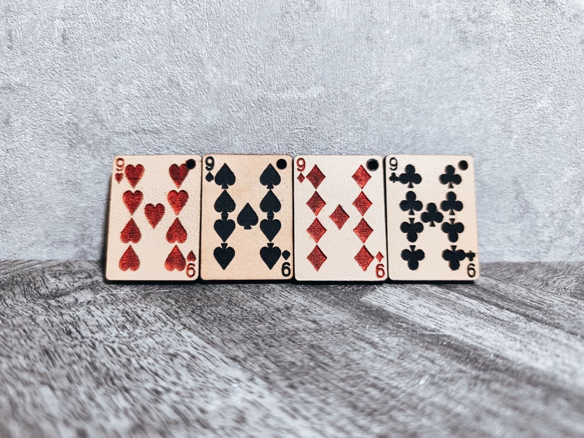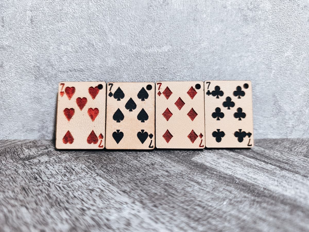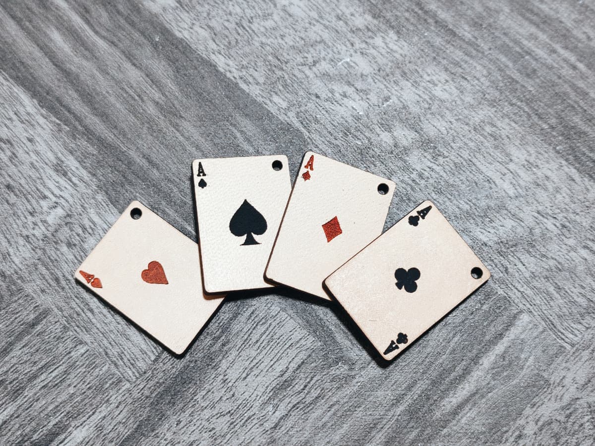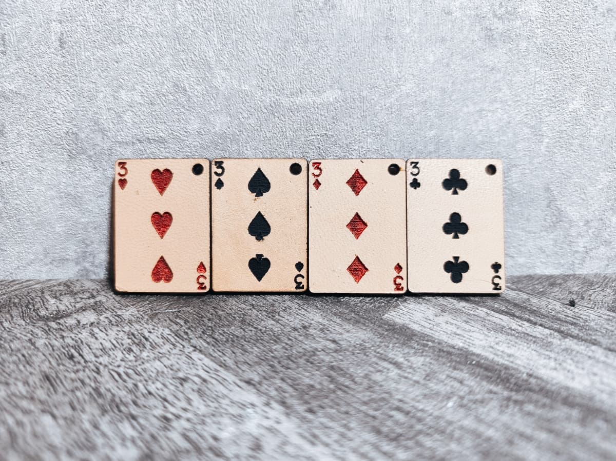 理論的に最も白いタンローと呼ばれる染色前のタンニン鞣し革に木材をヒートプレスにて強力に接着し、トランプの柄にレーザーで彫刻&カット&着色して仕上げました。
