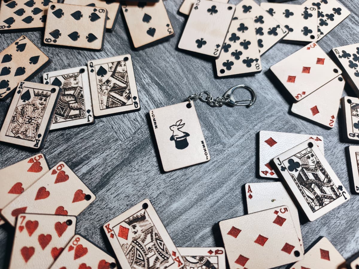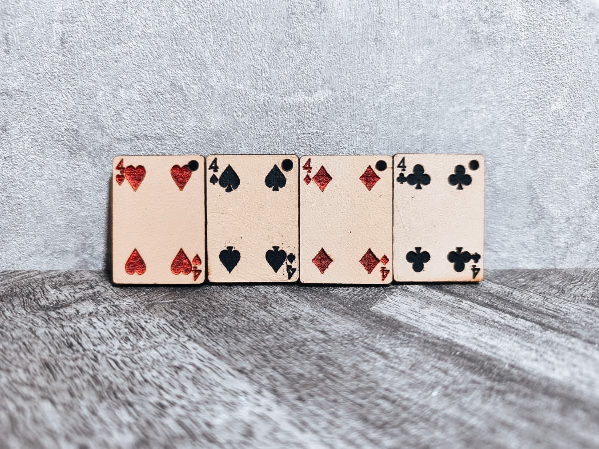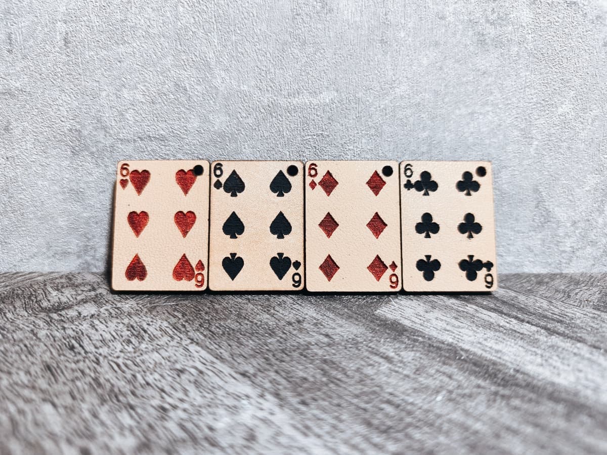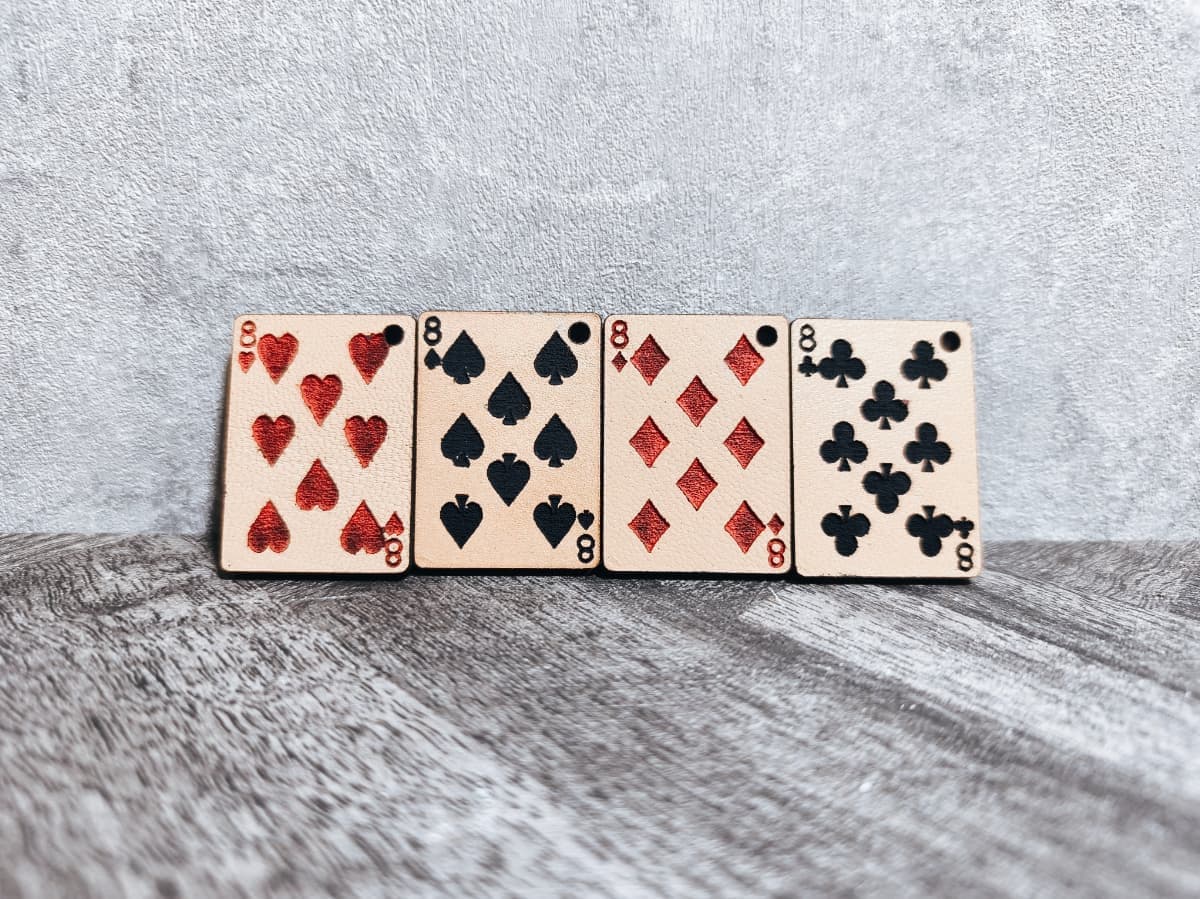 理論的に最も白いタンローと呼ばれる染色前のタンニン鞣し革に木材をヒートプレスにて強力に接着し、トランプの柄にレーザーで彫刻&カット&着色して仕上げました。