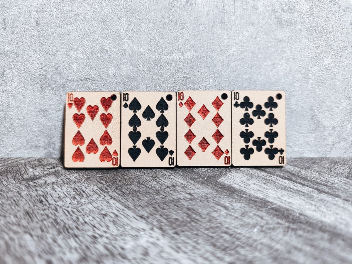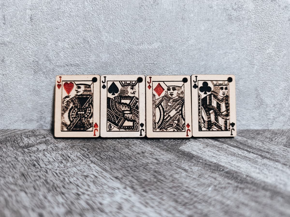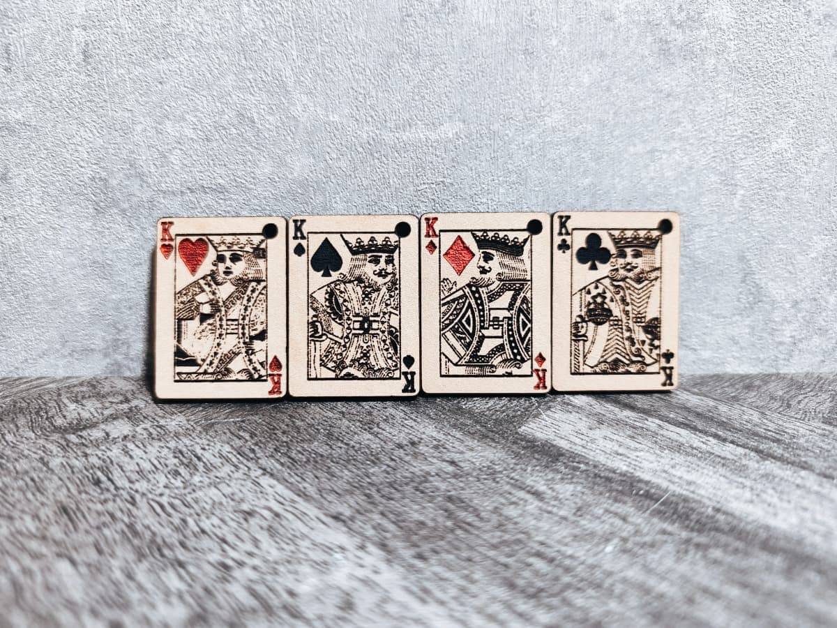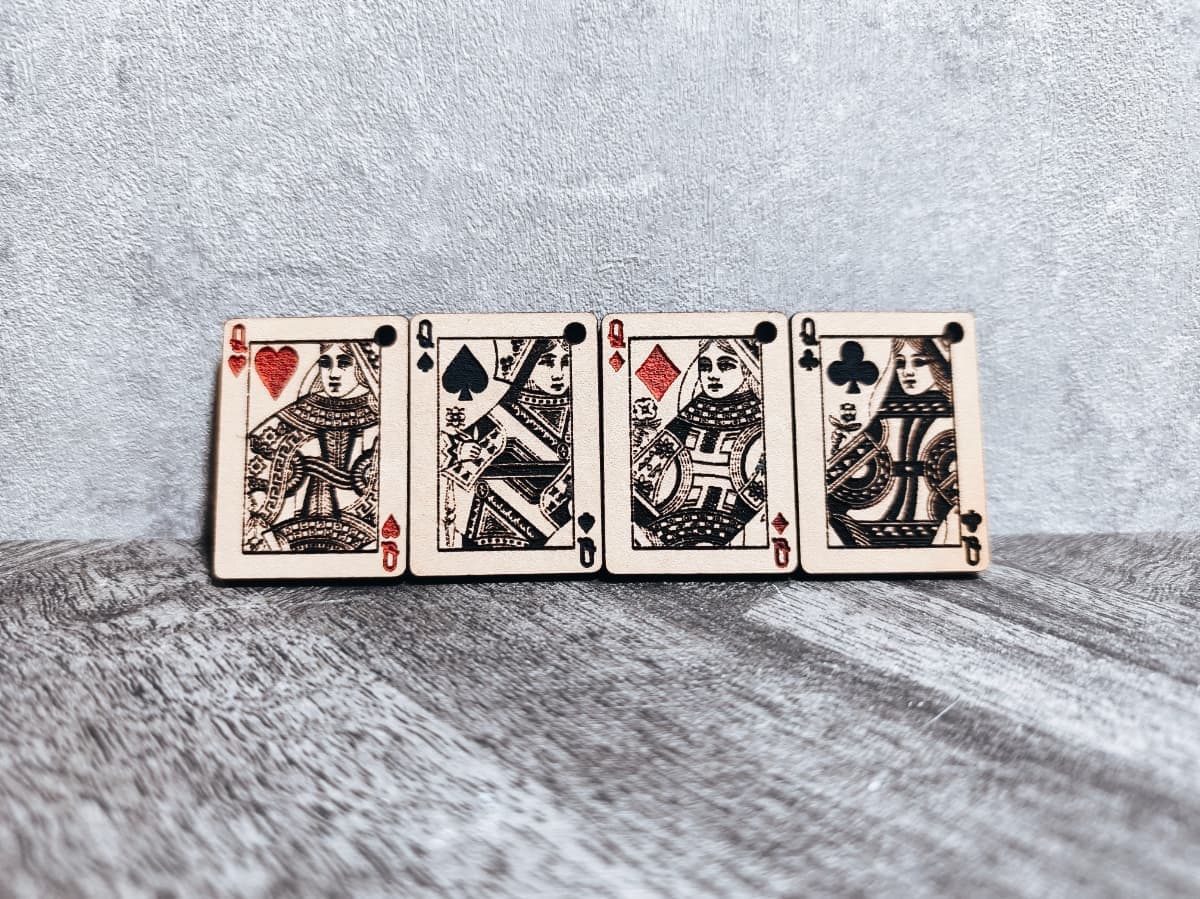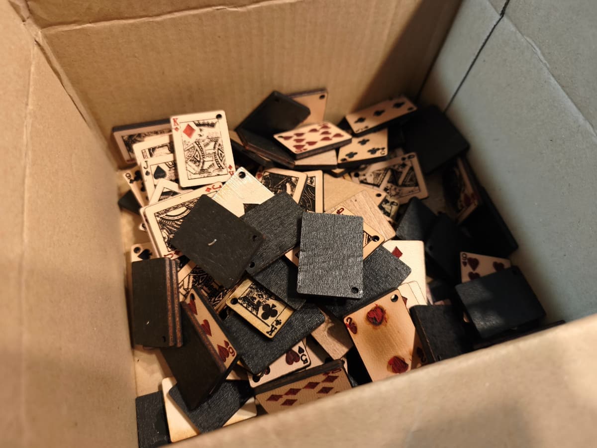 理論的に最も白いタンローと呼ばれる染色前のタンニン鞣し革に木材をヒートプレスにて強力に接着し、トランプの柄にレーザーで彫刻&カット&着色して仕上げました。