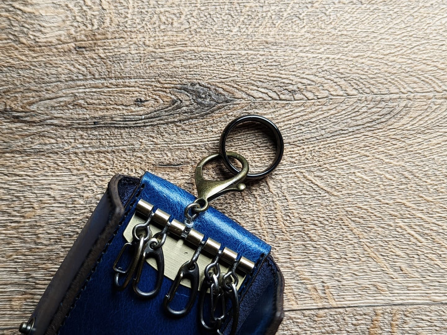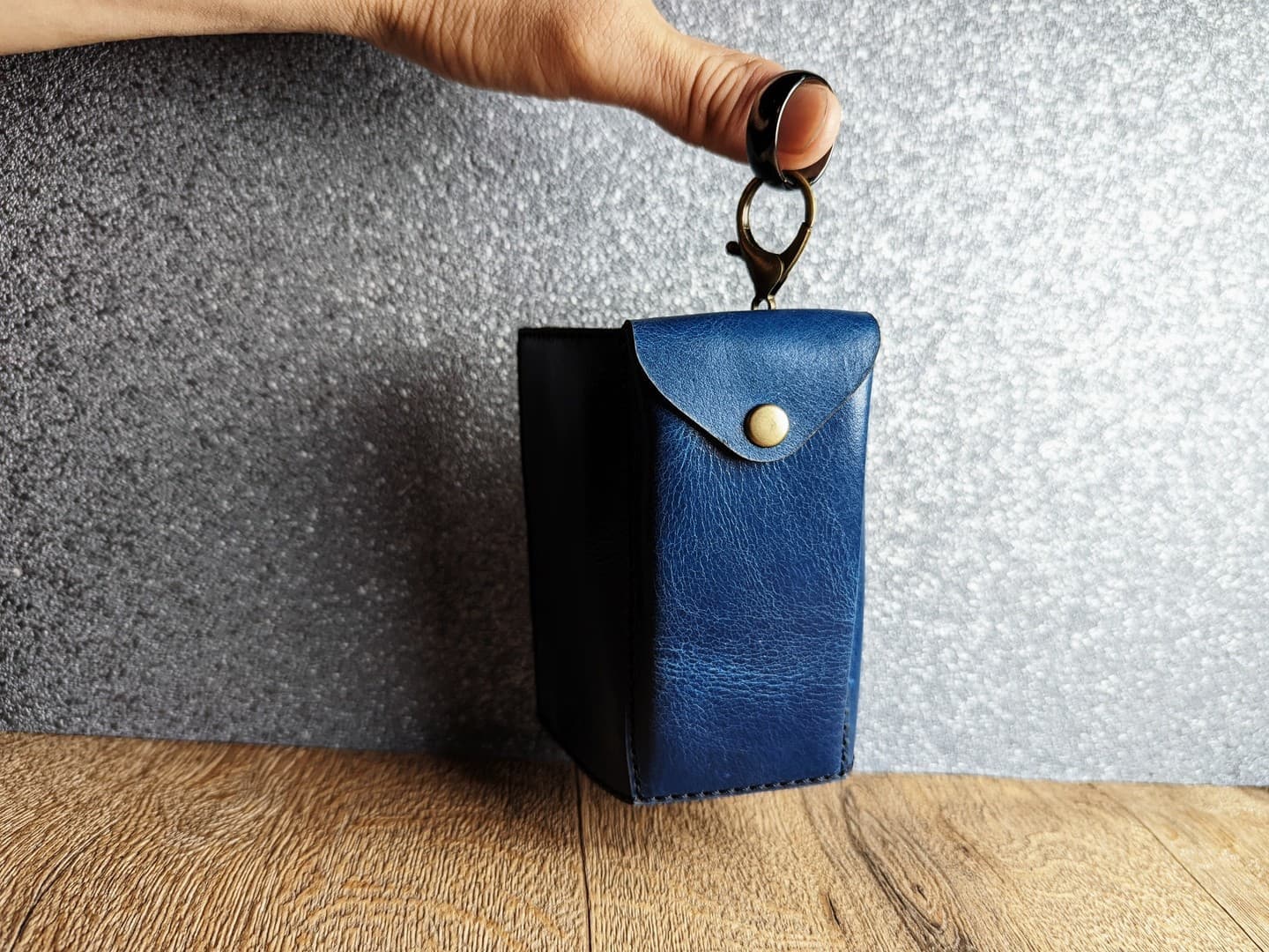 どこから見ても、普通のキーケースにしか見えませんが、ギミックを隠匿しつつスリムに見える形状、使用時の指の位置までも全て計算して設計しております。