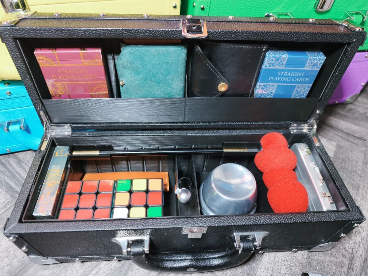 演技用のクロースアップケースである以上、道具を入れて持ち運ぶことを前提条件として製作いたしました。