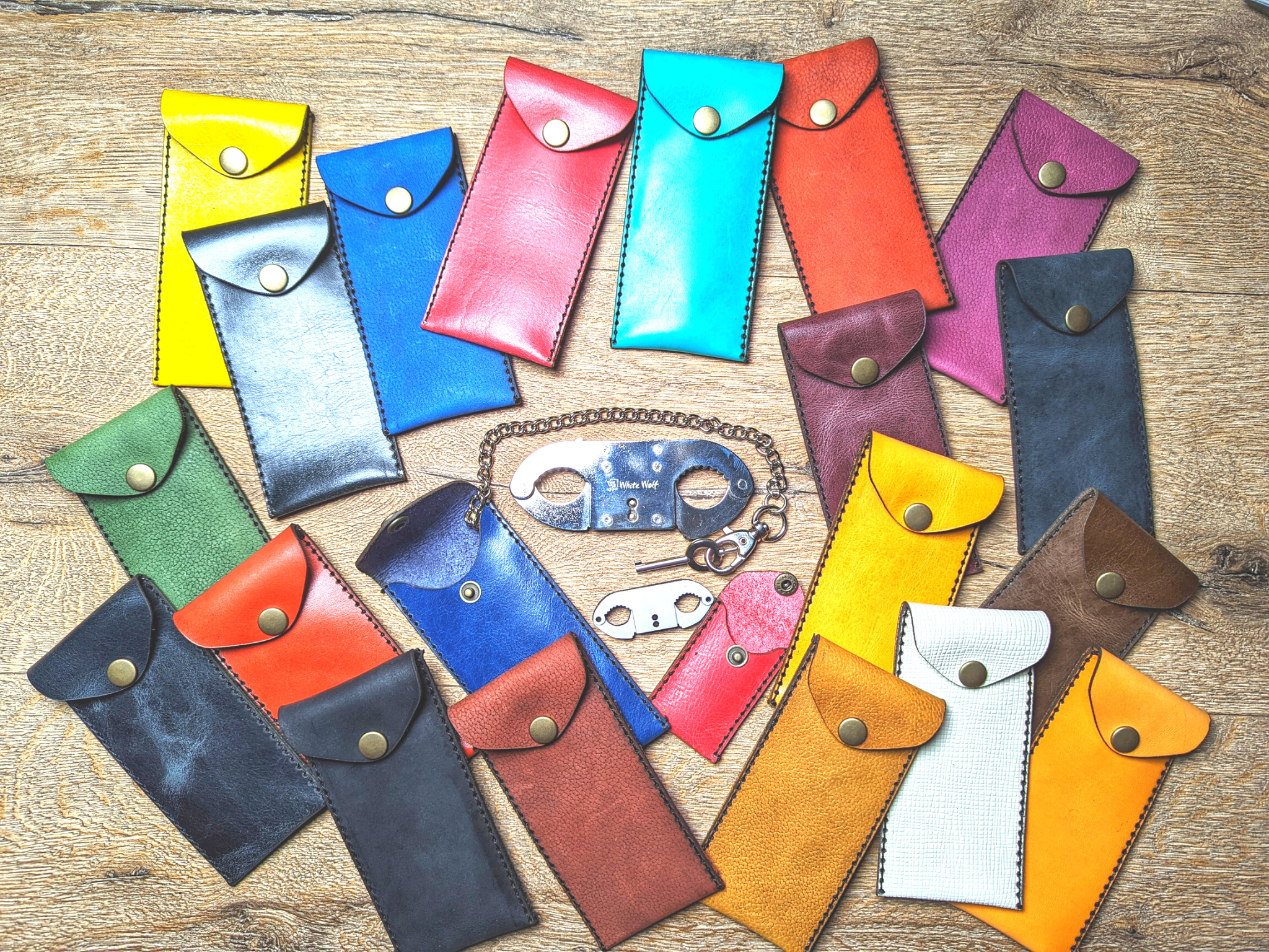 スマートに演じるための鍵用チェーンを取り付け、チェーンと鍵、そしてサムカフを入れてジャストフィットするサイズ感に調整しております。